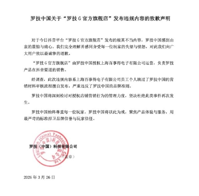 面對洶湧民意,羅技中國於上周四深夜緊急發布致歉聲明。聲明中表示:「對於抖音平台『羅技G官方旗艦店』發布的極其不當內容,羅技中國感到由衷的震驚與痛心。我們完全理解並感同身受每一位玩家的失望與憤怒,對此我們向廣大用戶致以最誠摯的道歉。」指出此次違規內容係該公司員工個人跳過羅技中國的行銷素材審核流程,擅自發布,嚴重違反品牌準則。