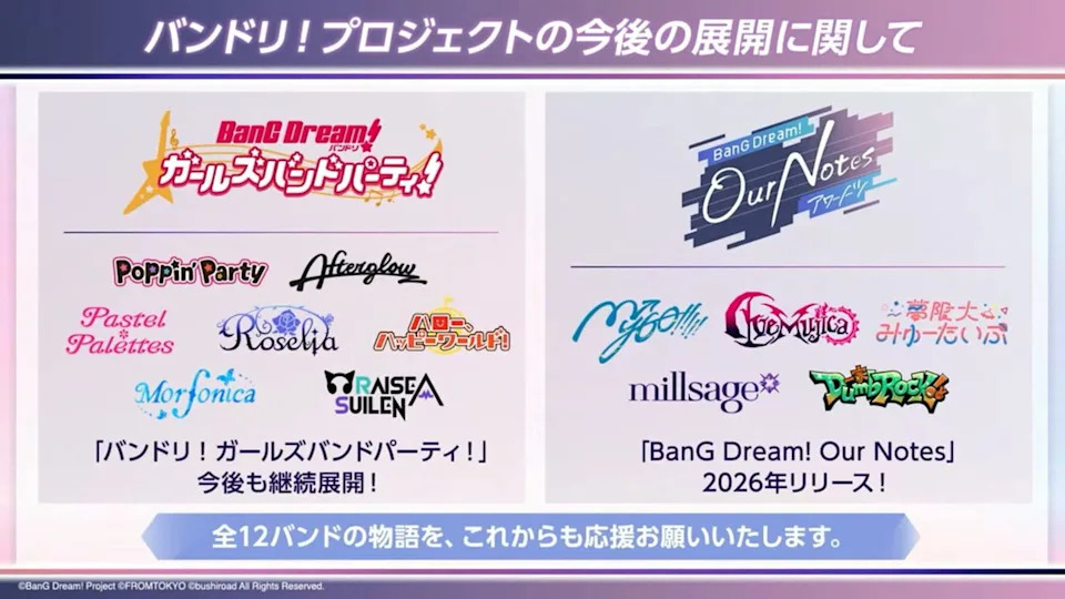 因此,未來兩款遊戲將採取「分家」策略:《樂團派對》繼續服務如Poppin'Party、Roselia等原有樂團,MyGO!!!!!與Ave Mujica的主力故事與活動轉移至《Our Notes》,舊遊戲中這兩團僅以角色客串形式出現於跨團交流場合,如學校或RiNG音樂廳,不再舉辦專屬單團活動。