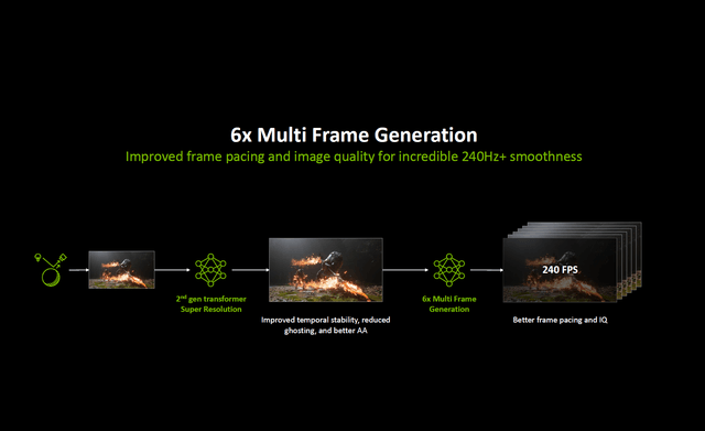 在快速移動物件(如車輛、武器或角色)時,常見的殘影(ghosting)問題也獲得顯著改善。新 AI 模型更精準地處理運動向量,減少拖曳痕跡,即使幀率大幅提升也不易察覺干擾。此外,超級解析度下的邊緣鋸齒現象同樣得到優化,角色移動時的邊緣更平滑自然,帶來更沉浸的視覺體驗。最受矚目的亮點是「6X Dynamic Multi-Frame Generation」動態多幀生成技術。相較 DLSS 4 的最多 4X 倍率,DLSS 4.5 可從單一渲染幀生成最多 6 幀,並引入動態模式,能自動根據顯示器更新率(如 144Hz 或 240Hz)在 1X 至 6X 之間切換,精準匹配目標幀率,避免撕裂並維持低延遲。