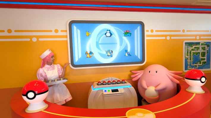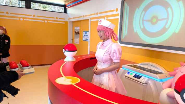 鎮上的「寶可夢中心」完美重現了遊戲與動畫中的經典空間。入口處有面帶笑容的 喬伊小姐 和 吉利蛋 迎接,踏入其中瞬間讓人感覺像在冒險途中稍作休息。最大的亮點是「回復機」體驗,將精靈球交給櫃檯後,熟悉的旋律響起,機器上的精靈球會隨節奏閃爍,螢幕上實時顯示寶可夢恢復活力的過程。最後 喬伊小姐 會說出那句經典台詞:「お預かりしたポケモンはみんな元気になりましたよ!(您寄存的寶可夢們全都恢復健康了!)」,令人感動。