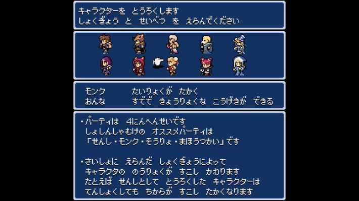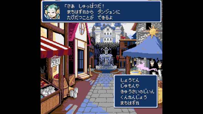 冒險的據點是功能齊全的「城下町」,商店、法術屋、旅館、寺院、訓練所等設施一應俱全,從創建角色、轉職到學習技能都能在此完成。這種往返於城鎮與地城之間、逐步強化隊伍的流程,正是地城 RPG 的王道樂趣。遊戲的新手引導相當親切,初次進入地城時會有妖精給予詳細提示,讓玩家能自然掌握操作與探索的基本知識。