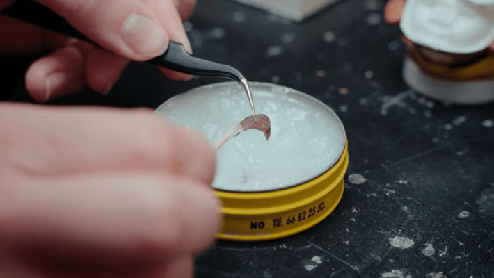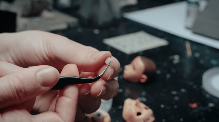眉毛的製作同樣展現了手工的極致。眉毛需要牢固地貼合在臉部面板上,但為了必要時的調整,團隊使用了可重複黏貼的接著蠟。更令人驚嘆的是,為了模擬真實的毛髮質感,他們在基礎紙片上再疊加更微小的紙片,所有這些繁複工序均是純手工完成。