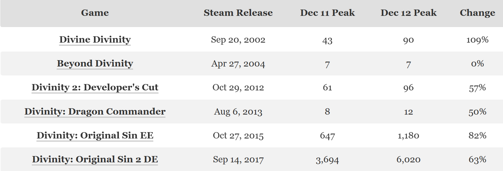 其他作品如《神諭:神聖》(Divine Divinity)和《神諭 2:開發者剪輯版》(Divinity 2: Developer's Cut)也有可觀增長,唯一例外是 2004 年推出的《神諭之外》(Beyond Divinity),玩家數保持不變。