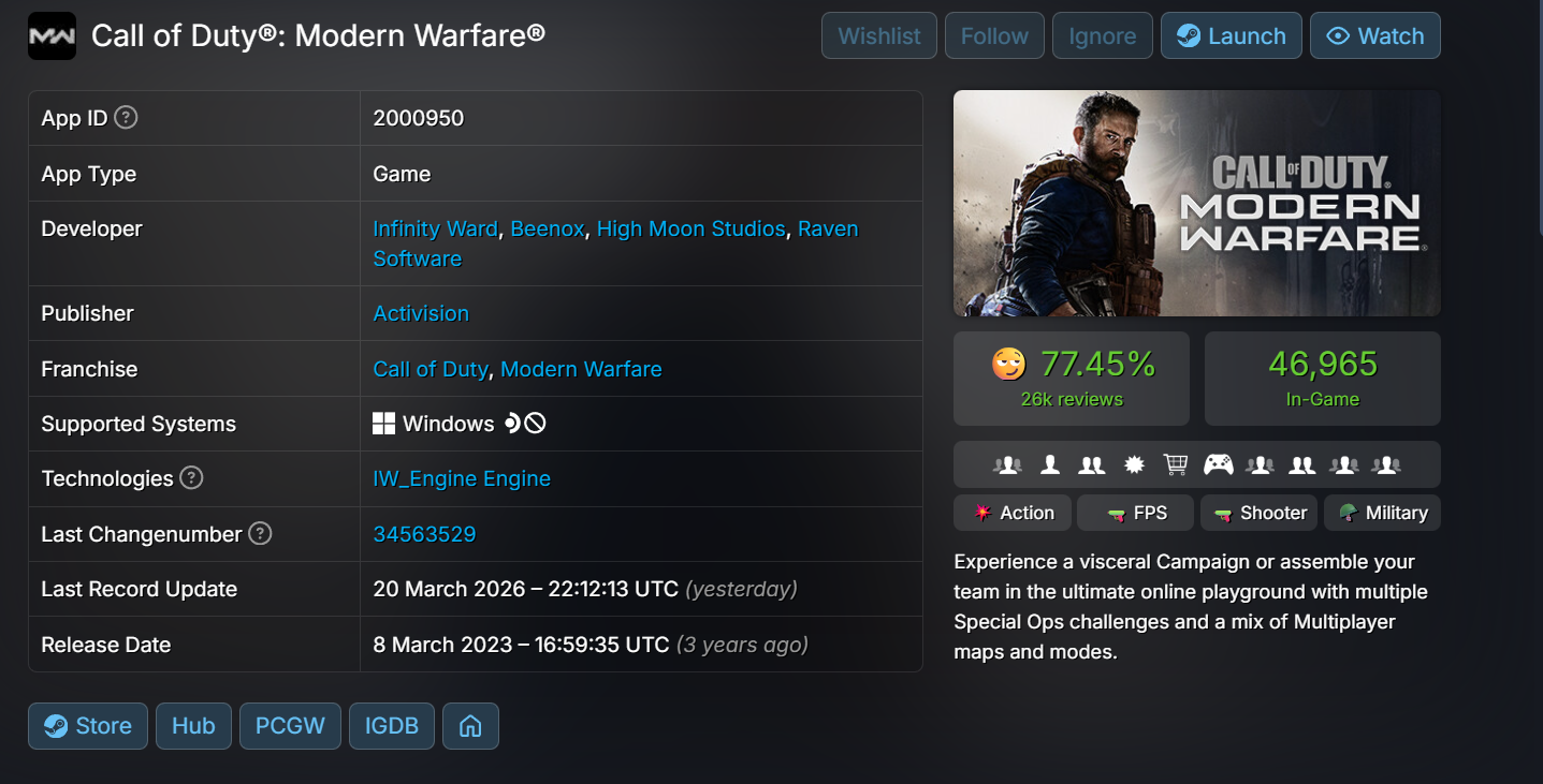 2019 年問世時,本作作為經典系列的重啟之作,其單人戰役迅速被譽為系列中最出色的作品之一;多人模式與採用的新一代 IW Engine 也被視為技術上的一大躍進。此次回流的人潮更超越了目前用於啟動多款現代《決勝時刻》作品的「Call of Duty」應用程式在 Steam 上的 24 小時峰值紀錄(41,230 人)。