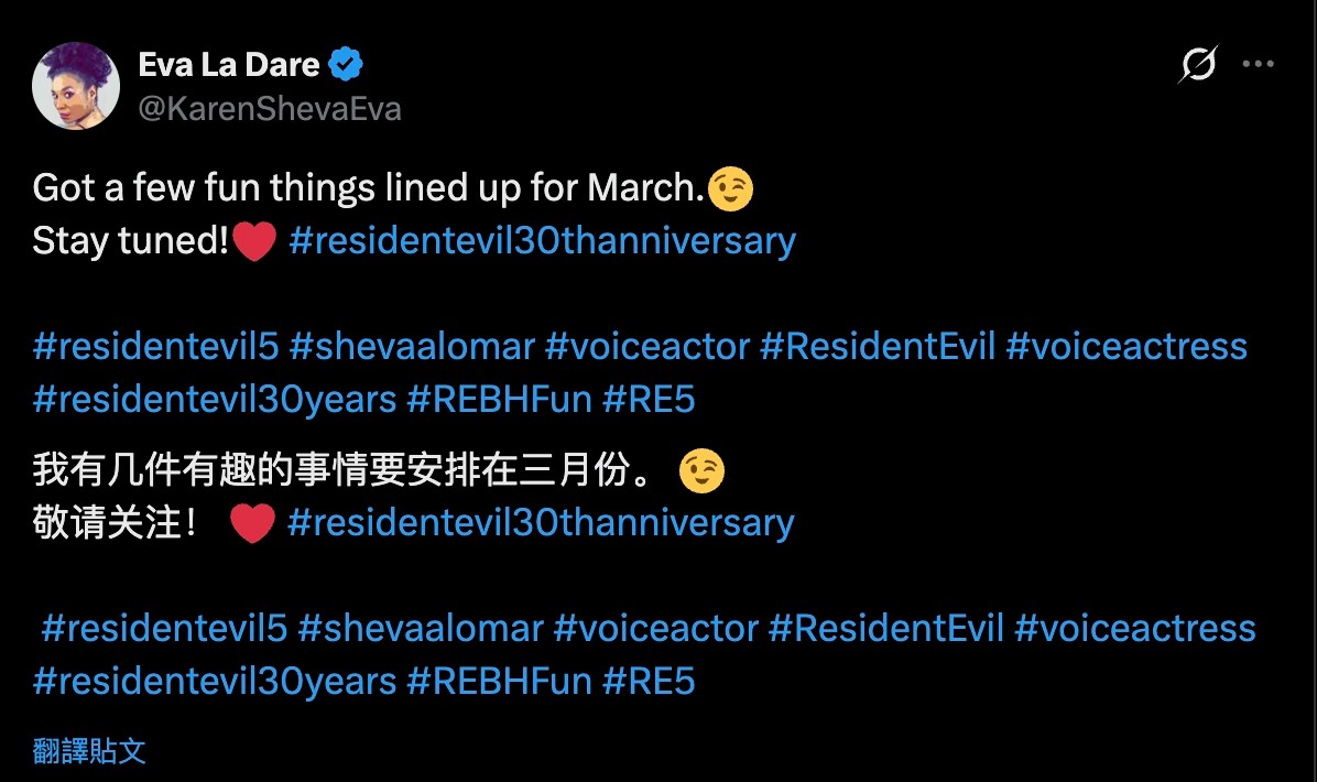 另一項引人遐想的證據,來自遊戲角色 Sheva Alomar 的配音及動態捕捉演員 Eva La Dare。她早前曾在社交平台 X(前稱 Twitter)上發文,預告三月將有令人興奮的消息,但暫時不能透露詳情。帖文中她使用了多個《生化危機》相關的主題標籤,包括「#RE5」以及慶祝系列30週年的標籤。自《生化危機 5》後,Sheva 便再未於系列作品中登場。不過,以往卡普空的《生化危機》重製作品均未起用原班配音演員陣容,若然她真的回歸,將是首個例外。