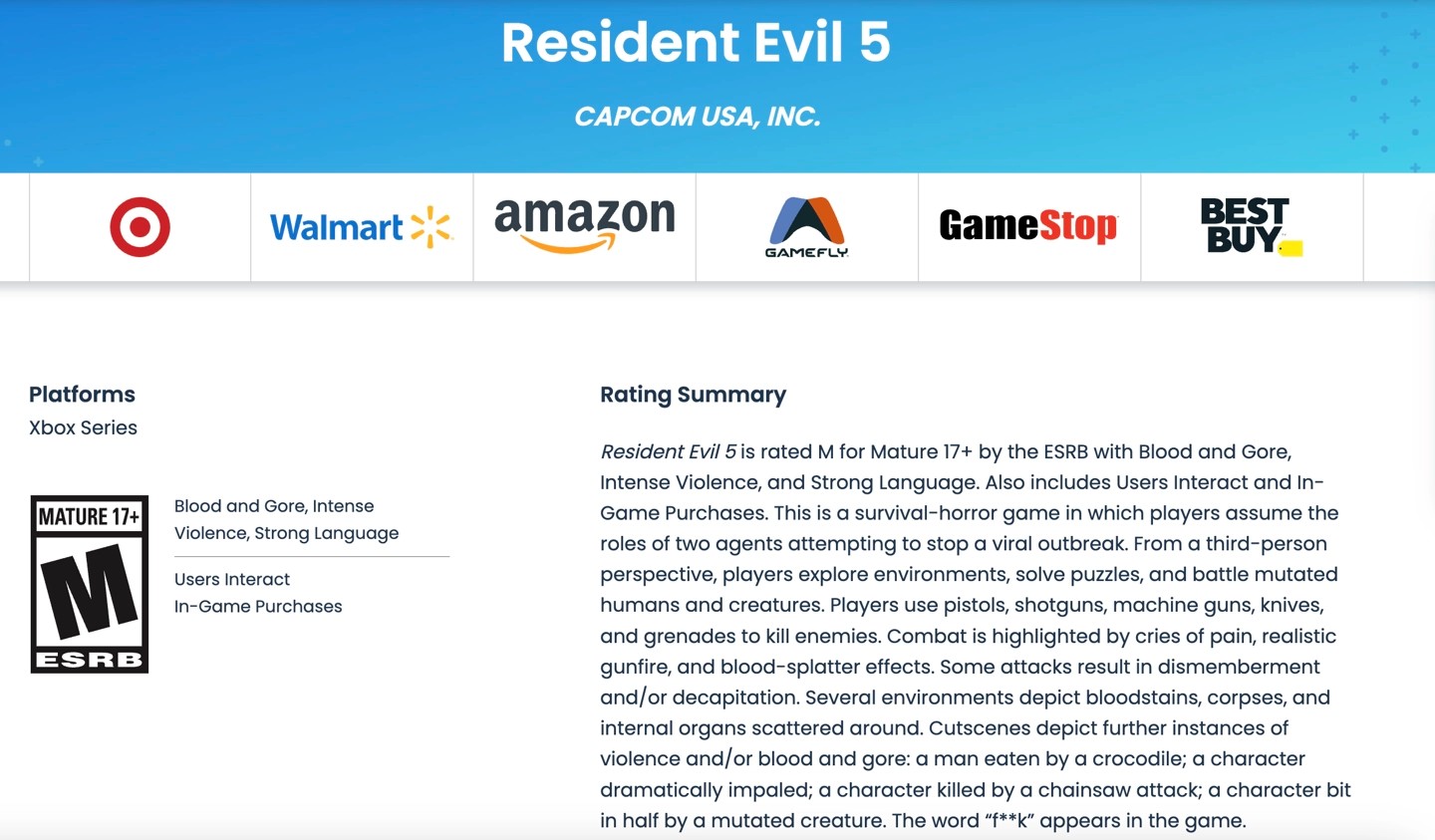 線索首先來自娛樂軟體分級委員會(ESRB)網站。2月10日,有玩家發現網站上出現了一個針對 Xbox Series X/S 平台的《生化危機 5》遊戲評級。值得注意的是,雖然原版遊戲可透過向下兼容功能在該主機上遊玩,但並不存在專為 Series X/S 設計的原生版本。這份評級內容雖然大部分是描述遊戲為何獲得「M17+」評級,但其中提到了「遊戲內購買」項目,這點引發了猜測。原版《生化危機 5》雖曾推出追加下載內容,但在《生化危機 5 黃金版》發佈後,這些內容都已整合進主遊戲中。反觀卡普空近年推出的其他《生化危機》重製版,均加入了微交易元素,這令外界相信,此次評級很可能是針對一個完整重製版。