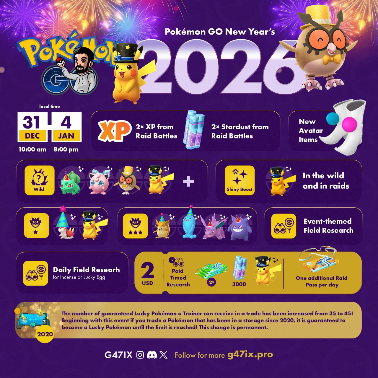 為迎接新一年來臨,Niantic 在《Pokemon GO》中推出年度新年慶祝活動,讓玩家可在節日期間享受特別獎勵及捕捉限定寶可夢。活動將於2025年12月31日上午10時(當地時間)開始,並持續至2026年1月4日晚上8時。