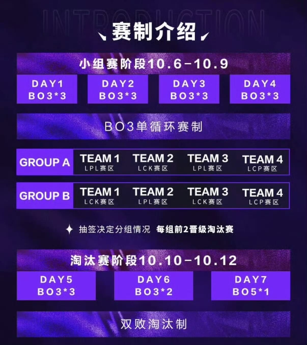 小組賽(10月6-9日):采用BO3單循環賽制,抽籤分組後,每組前2名晉級淘汰賽;