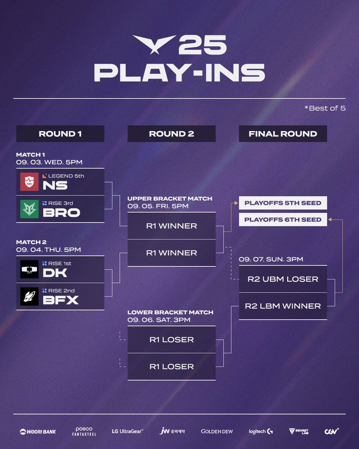 根據賽制,LCK傳奇組排名前四Gen.G、HLE、T1、KT已經率先晉級至季後賽,排名第五的NS需要與崛起組前三名DK、BFX、BRO爭奪最後兩個季後賽席位。